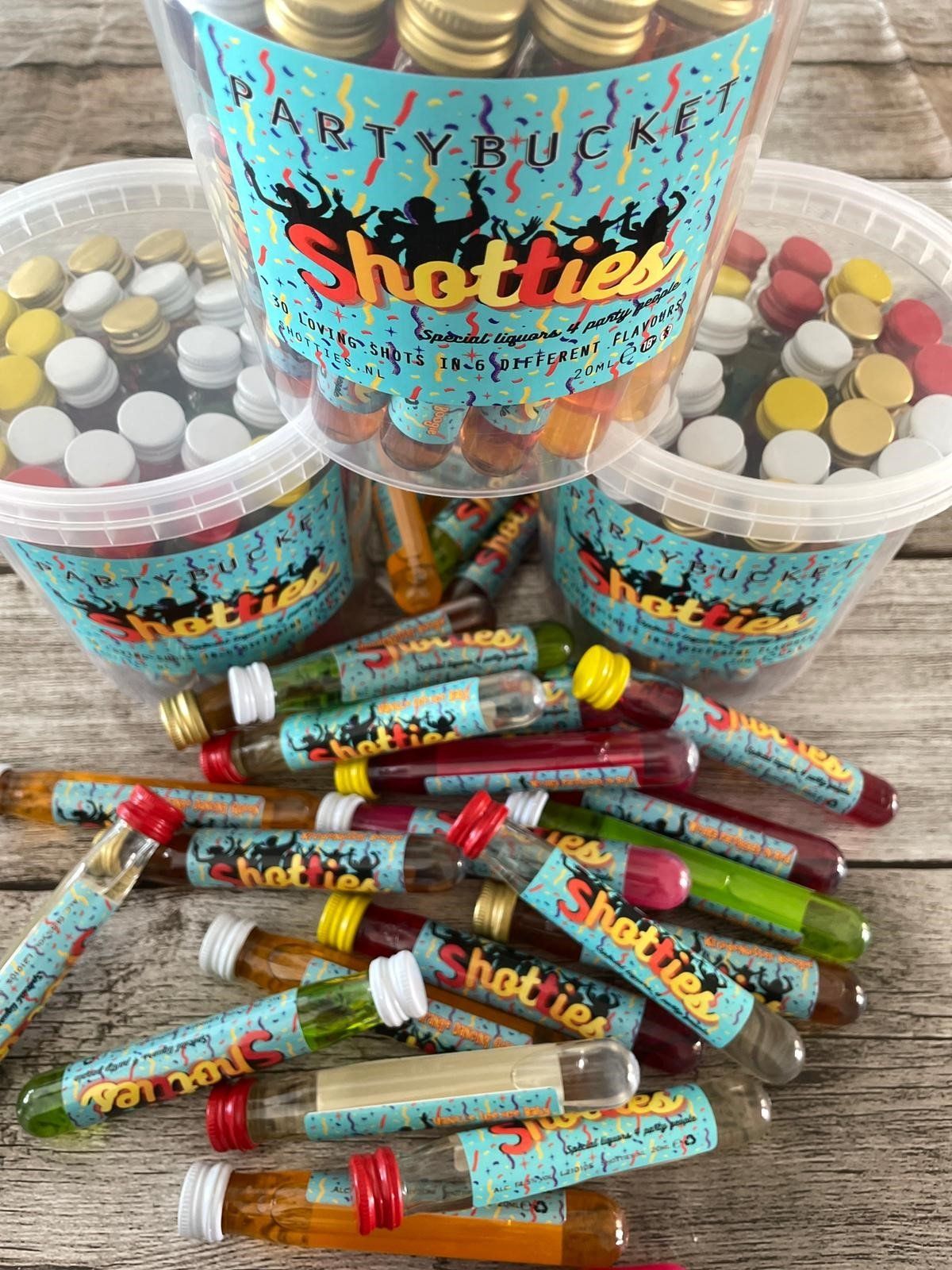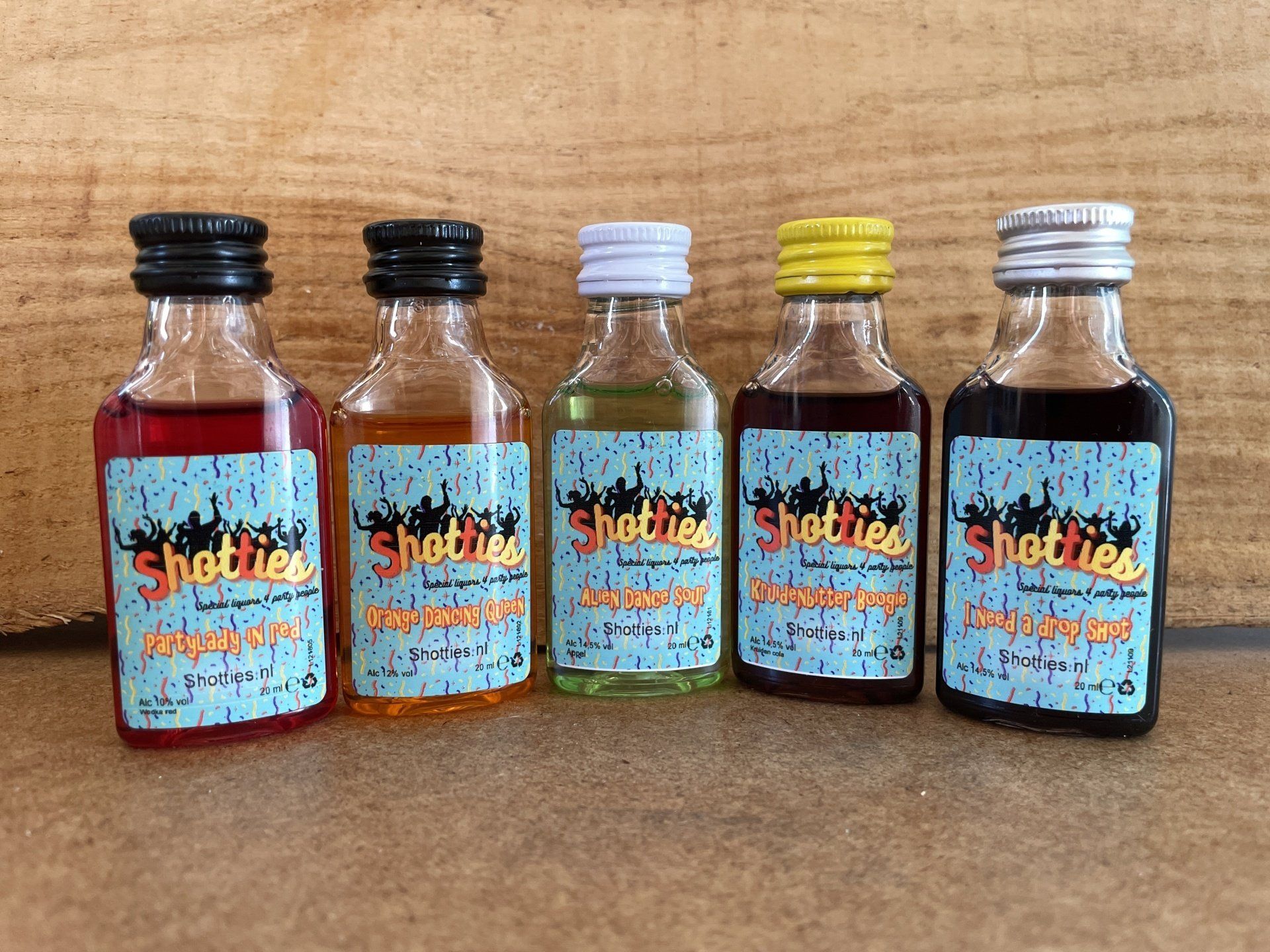 Shotties is het nieuwste en lekkerste partyshot voor iedereen! Of je nu thuis, gezellig met vrienden of op een feestje bent: Shotties smaakt overal! Wij hebben een heel palet aan kleuren en smaken ontwikkeld en vullen deze af in polycarbonaat flesjes. Ideaal voor festivals en andere evenementen. Hoe gaaf is dat! Met maar liefst 9 heerlijke smaken zit er voor iedereen wel een Shottie tussen! Ontdek snel jouw favoriet, want één ding kunnen we je beloven: die zit er zeker tussen!